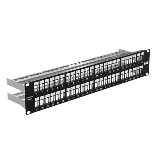 Πάνελ Μικτονόμησης με 48 υποδοχές σύνδεσης Keystone γενικής χρήσης με τεχνολογία LCL. Σχεδιασμένο σε μορφή Rack-mount 19" και ύψος 2U. Ειδικά κατασκευασμένο για χρήση με λεπτές υποδοχές CAT5e, CAT6, CAT6A και CAT8.