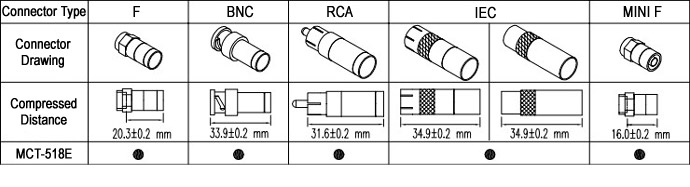 Το εργαλείο συμπίεσης πολλαπλών συνδετήρων MCT-518E της FENGER χρησιμοποιείται για τερματισμό των ομοαξονικών καλωδίων, προσφέροντας ασφαλή και υψηλής ποιότητας σύνδεση. Το εργαλείο λειτουργεί με ομοαξονικούς συνδετήρες συμπίεσης RG6 και RG59 συμπεριλαμβανομένων των F, BNC, RCA, IEC και Mini F.