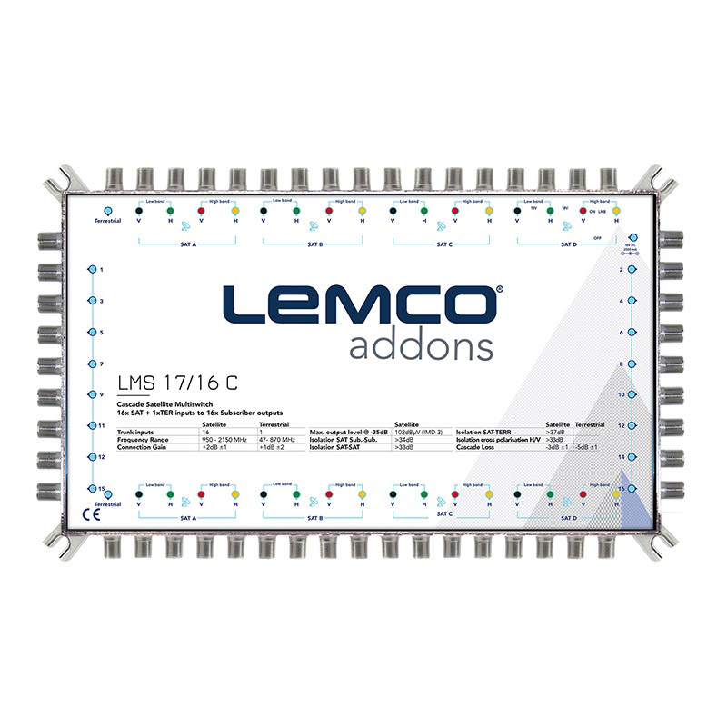 Ο Πολυδιακόπτης LMS-1716S της LEMCO είναι κατάλληλος για επεξεργασία και διανομή 4 δορυφορικών θέσεων (16 πολικότητες) και των επίγειων τηλεοπτικών σημάτων σε δίκτυα με συνδεσμολογία αστέρα. Πρόκειται για ένα σύστημα ευέλικτο και ιδιαίτερα αποτελεσματικό που εξασφαλίζει κάλυψη για 16 χρήστες. Ο LMS-1716S αποτελεί ένα ενεργό σύστημα matrix με εσωτερικούς ενισχυτές για την αναπλήρωση της απώλειας διέλευσης του σήματος. Το ενσωματωμένο τροφοδοτικό χρησιμοποιείται για την παροχή τάσης στους εσωτερικούς ενισχυτές και το LNB.