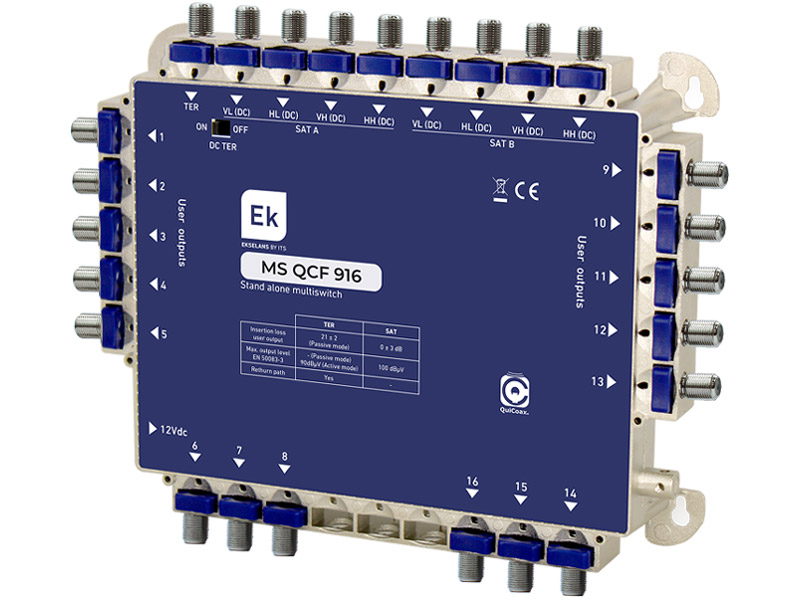Πολυδιακόπτης Stand Alone για 2 δορυφορικές θέσεις με 9 εισόδους (8 SAT + 1 TER) και 16 εξόδους χρηστών, κατάλληλος για την επεξεργασία και διανομή δορυφορικών και επίγειων σημάτων σε μικρού και μεσαίου μεγέθους συστήματα. Τροφοδοτείται από εξωτερική μονάδα (περιλαμβάνεται), για παροχή τάσης στους εσωτερικούς ενισχυτές και τα LNBs. Ο MS-QCF-916 προσφέρει εξαιρετική απόδοση και ευελιξία, με συμπαγή σχεδιασμό για εγκαταστάσεις ακόμη και σε περιορισμένους χώρους.