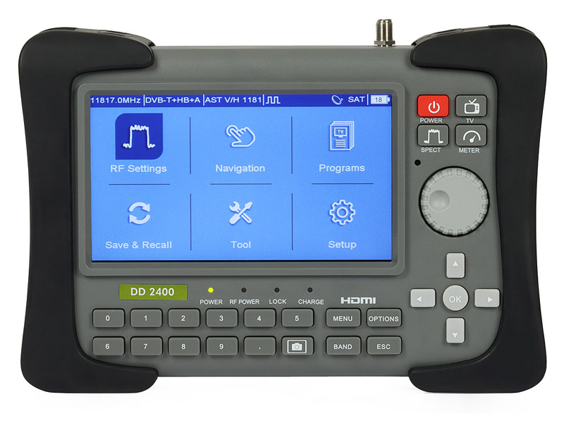 Ο επαγγελματικός μετρητής πεδίου DD 2400 είναι σχεδιασμένος για τη μέτρηση ραδιοηλεκτρικών σημάτων που μεταδίδονται σύμφωνα με τα πρότυπα DVB-S/S2, DVB-T/T2 και DVB-C. Επιτρέπει επίσης τη μέτρηση σημάτων στις ζώνες κινητής τηλεφωνίας LTE1/4G και LTE2/5G. Ο μετρητής πραγματοποιεί μετρήσεις ποσοστού σήματος στάθμης ισχύος για WiFi 2.4GHz (IEEE 802.11b/g/n).