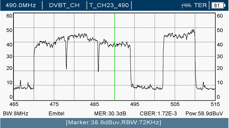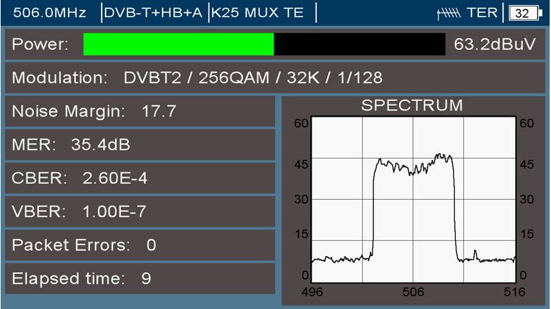 - Μετρήσεις ισχύος καναλιού, περιθώριο θορύβου, MER, CBER, VBER, σφάλματα TS και αστερισμός